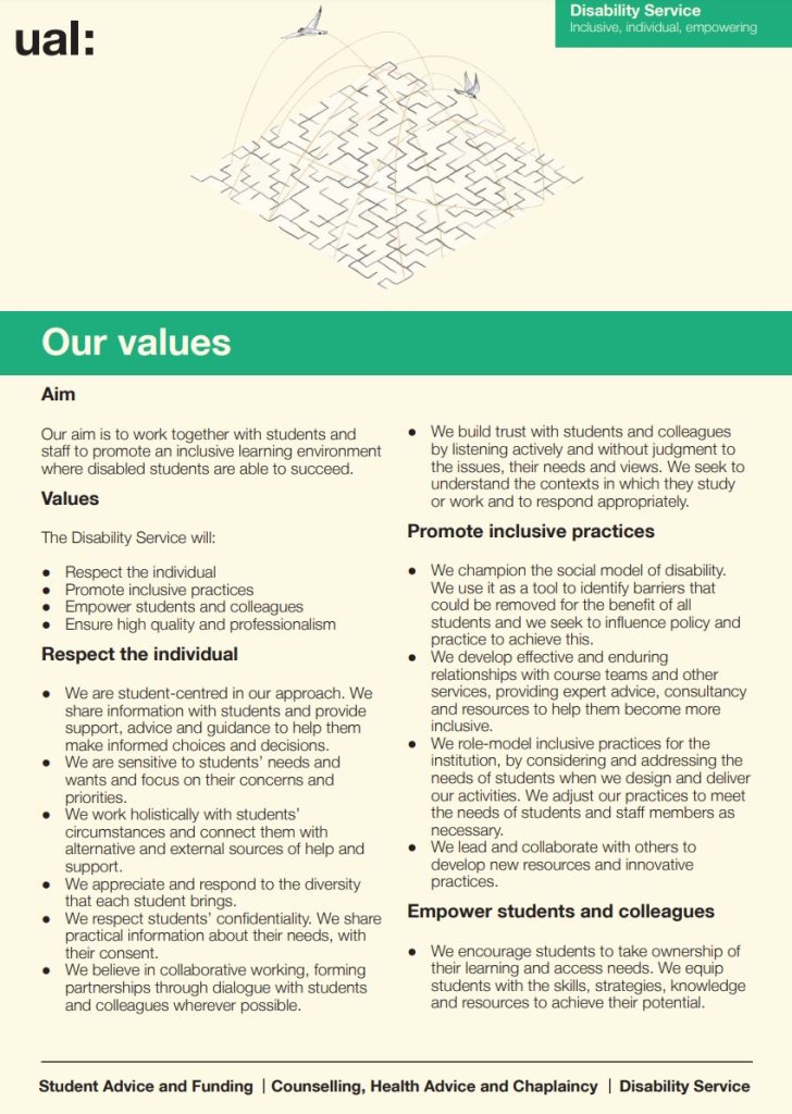 UAL (2023) Disability services: Our Values. Available at https://www.arts.ac.uk/__data/assets/pdf_file/0029/28829/Disability-Service-Values-PDF-1080-KB.pdf Accessed 20th November 2023